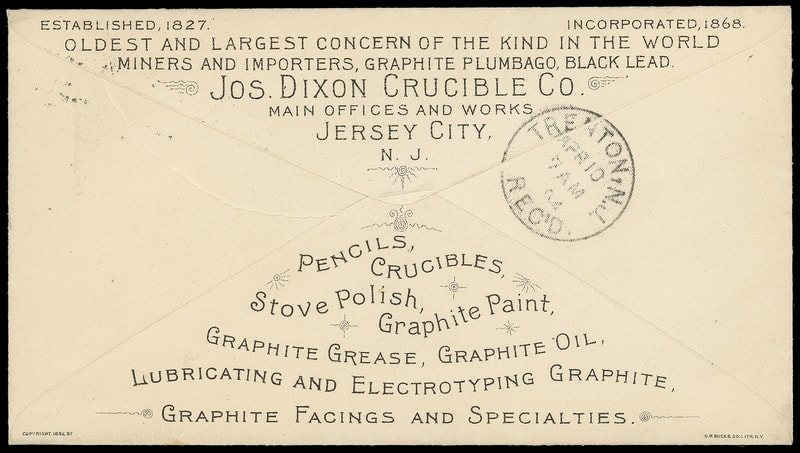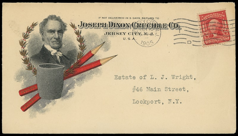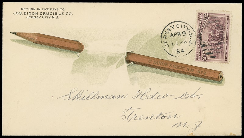 (Manufacturing) Joseph Dixon Crucible Co., Jersey City N.J., multicolored illustrated ad designs on two covers; one showing pencil punch through paper bearing 2¢ Columbian (231); other with Dixon Portrait, Crucible and Pencils bearing 2¢ shield (319), small nick, other showing Pencil, Crucibles and Graphite, on covers franked with 2¢ carmine tied by 1907 Philadelphia cds and 1901 Jersey City, N.J. machine postmark respectively, ad text on reverse and later with enclosure; former with partial backflap and small tear at top, Very Fine., Very Fine pair.
