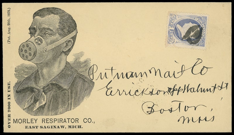 (Manufacturing) Morley Respirator Co., East Saginaw, Michigan, illustrated advertising design showing man wearing respirator on unsealed amber cover bearing 1¢ ultramarine (182), large margins, neatly cork canceled to Boston Mass., Dorchester (8.29) arrival backstamp, Extremely Fine gem.