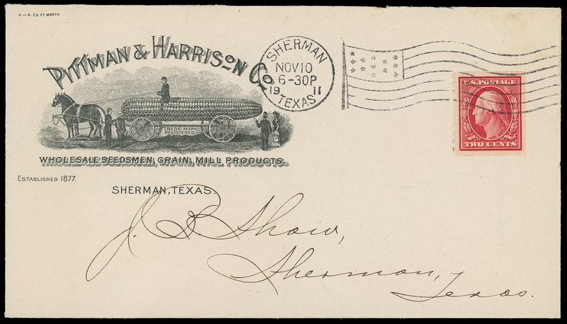 (Farming) Wholesale Seedsmen, Grain, Mill Products, Puttman & Harrison Co., Sherman, Texas, illustrated ad showing horse-drawn corn carriage , overal text ad on reverse of cover bearing 2¢ carmine coil tied by "Sherman, Texas Nov 10, 1911" flag machine cancel to local address, Extremely Fine.
