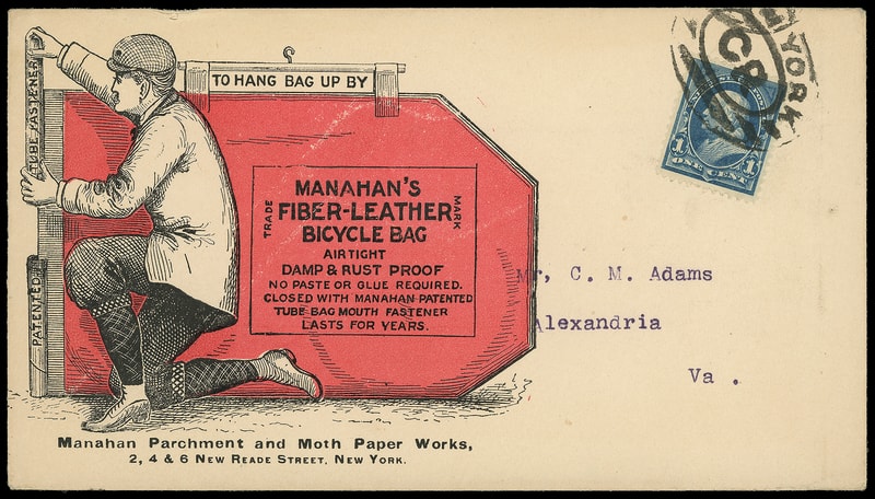 (Bicycles) Manahan's Fiber-Leather Bicycle Bag, New York N.Y., bicolor illustrated ad showing leather bicycle bag on amber cover bearing 1¢ dark blue (264) , well centered with rich color, tied by bold "New York, CR" oval to Alexandria Va., Very Fine and choice.