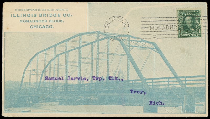(Manufacturing) Illinois Bridge Co., Chicago Ill., overall blue illustrated ad showing bridge on unsealed cover bearing 1¢ green (300) tied by "Chicago, Ill., 1905" third-class machine cancel to Troy, Mich., May 12th arrival backstamp; some edge wear, Very Fine.