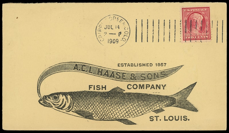 (Food & Drink) A.C.L. Haase & Sons, Fish Company, St. Louis, Mo., illustrated return envelope showing fish on buff cover bearing 2¢ Lincoln (367) tied by "Cripple Creek, Colo. Jul 14, 1909" machine cancel to St. Louis Mo., Extremely Fine.