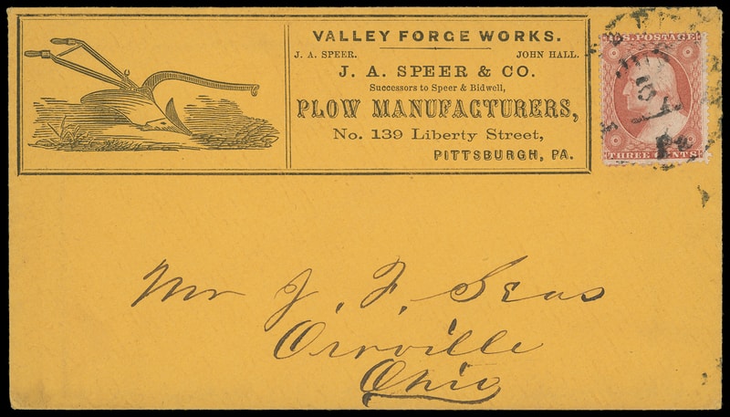 (Manufacturing) Valley Forge Works, J.A. Speer & Co., Pittsburgh Pa., illustrated ad showing plow on orange cover bearing 3¢ dull red (26) tied by "Pittsburgh Pa., Jun 5" cds to Orrville, Ohio, Extremely Fine.