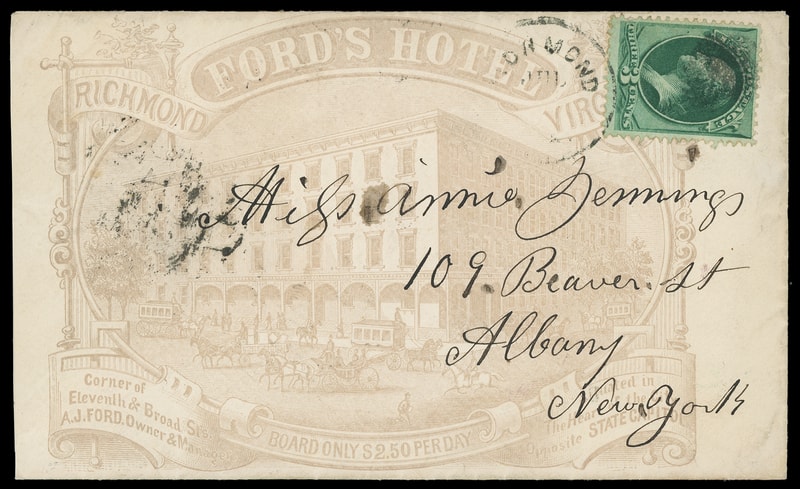(Hotels) Ford's Hotel, Richmond, Virginia, all-over building ad cover bearing 3¢ green (158) tied by "Richmond Va., Jul" duplex to Albany N.Y., Carrier cds backstamp; reduced at left, Very Fine.