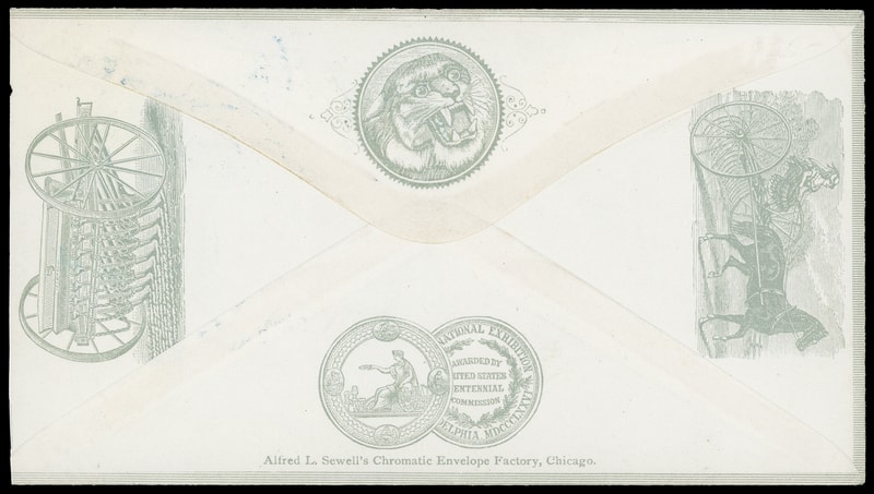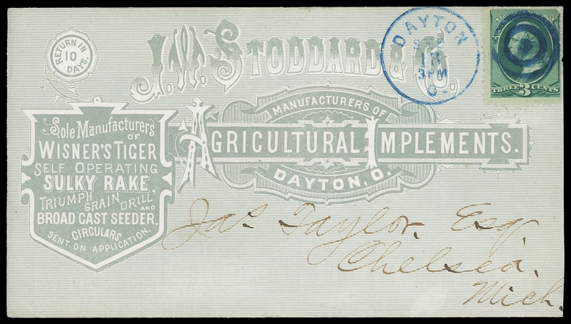(Manufacturing) J.W. Stoddard & Co., Manufacturers of Agriculture Implements, Dayton Ohio, all-over green shaded ad cover with illustrated equipment on reverse, bearing 3¢ green (184) tied by bold blue target duplexed with "Dayton O. Sep 18" cds to Chelsea, Michigan; reduced slightly at right, Very Fine and quite attractive.