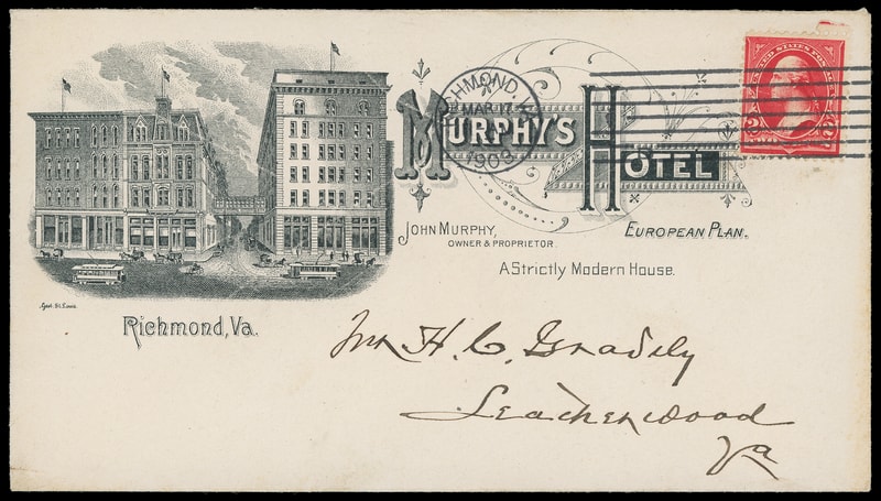 (Hotels) Murphy's Hotel, Richmond Va., beautiful building ad design on cover bearing 2¢ red (279B) tied by "Richmond, Va. Mar 17, 1903" machine cancel to Va. town, Extremely Fine.