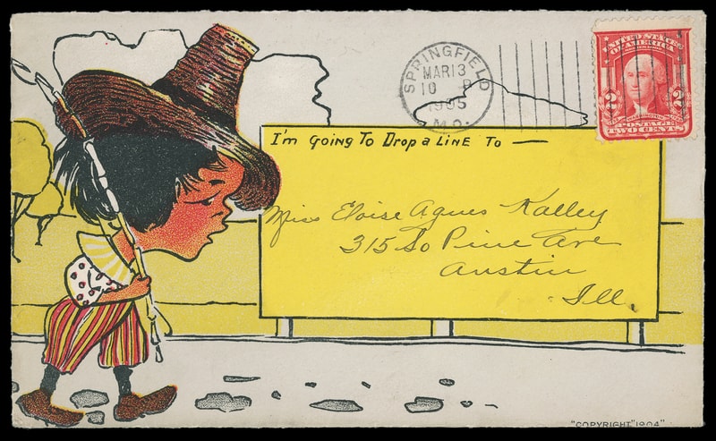 (Illustrated) "I'm going to Drop a Line", sentiment on colorful multicolored illustrated cover showing Boy walking with Fishing Rod on cover bearing 2¢ carmine (319) tied by "Springfield, Mo. Mar 19, 1905" machine cancel to Austin Ill., Extremely Fine and attractive.