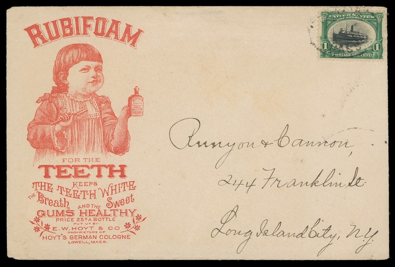 (Dental) Rubifoam, Keeps the Teeth White, E.W. Hoyt & Co., Lowell Mass., red illustrated advertising featuring young girl with bottle on unsealed cover bearing 1¢ Pan-American (294) tied by "Lowell, Mass." oval to Long Island City N.Y., Very Fine.