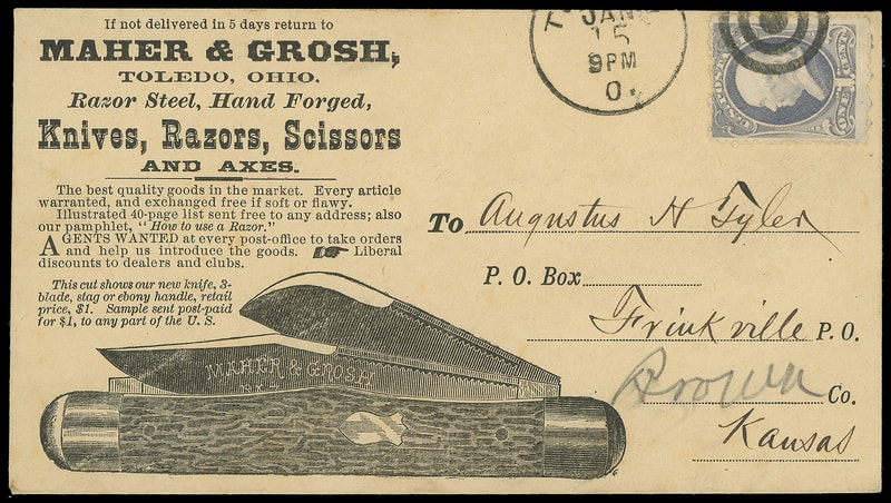 (Hardware) Knives, Razors, Scissors and Axes, Maher & Grosh, Toledo Oh., illustrated ad design showing pocket knife on unsealed light buff cover bearing 1¢ grey blue (206) tied by target cancel duplexed with partial "Toledo O. Jan 15" cds to Friukville, Kansas, Extremely Fine.