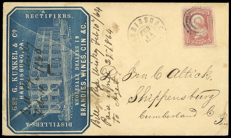 (Alcohol) Geo. G. Kunkel & Co., Distillers & Rectifiers, Harrisburg Pa., blue illustrated building cameo on light buff cover bearing 3¢ rose (65) just tied by four-ring cancel, matching partial "Harrisburg Pa., Feb 11, 1864" cds to Shippensburg Pa., 1864 docketing on ad; reduced a bit at right, F.-V.F.