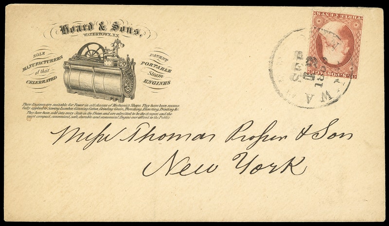 (Manufacturing) Portable Steam Engines, Hoard & Sons, Watertown N.Y., illustrated ad design on cover bearing 3¢ dull red (26) tied by partial "Watertown N.Y. Sep 12, 1859" cds to New York City; some edge war, Very Fine.