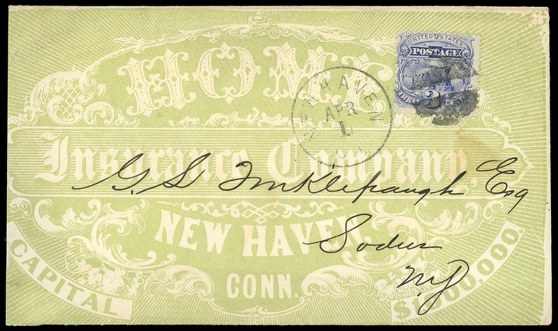(Insurance) Home Insurance Company, New Haven, Conn., overall green advertising cover bearing 3¢ ultramarine (114) tied by split cork duplexed with "New Haven Ct. Apr 1" cds to Sodus N.Y.; reduced a bit at left, light tone spot, F.-V.F. and attractive.