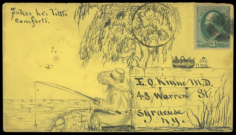 (Hand Illustrated) Man Fishing "Takes he's little comforts", overall design on yellow cover bearing 3¢ green (207) tied by quartered cork duplexed with "Rochester N.Y. Sep 3" cds to Syracuse N.Y.; cover tear, flap missing, otherwise Very Fine and fantastic hand-illustrated design.