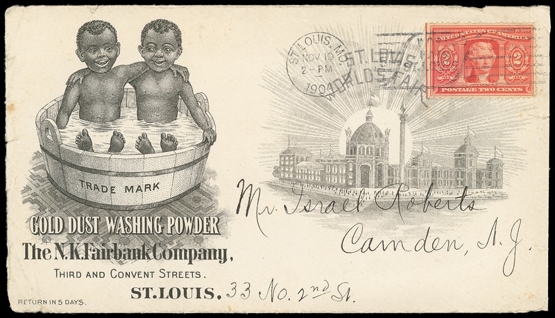 (Ethnic) Gold Dust Washing Powder, illustrated ad design showing Gold Dust Twins in Tub and additional 1904 St. Louis Fair Expo design on cover bearing 2¢ Louisiana Purchase (324) tied by "St. Louis, Mo. Nov 19, 1904" expo machine cancel to Camden N.J.; edge wear and reduced slightly at right, F.-V.F. and scarce Ethnic Expo advertising combination.