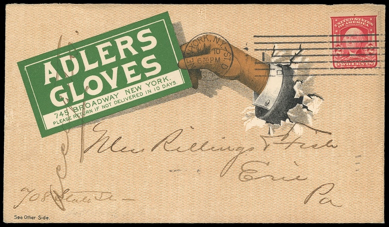 (Clothing) Adlers Gloves, New York City, multicolor overall ad on front and back showing hand holding card on cover bearing 2¢ shield (319) tied by "New York, N.Y. - St. D, May 10, 1904" machine cancel to Erie Pa., docketed "accounts", Very Fine and striking.