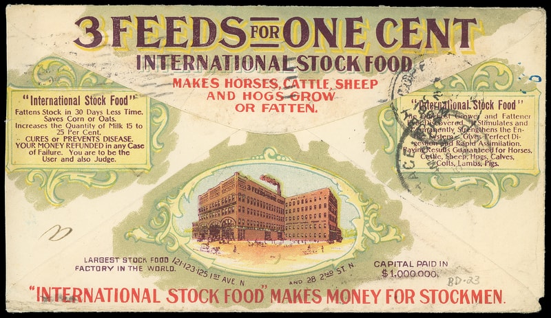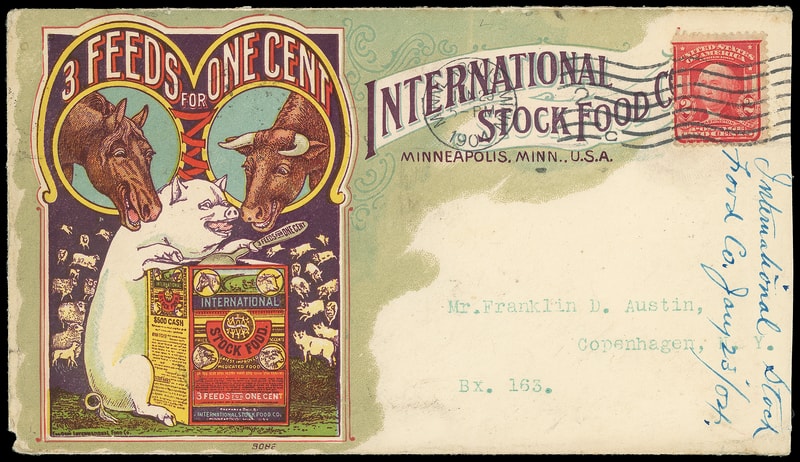 (Animal) International Stock Food Co., Minneapolis Minn., multicolored illustrated ad cover bearing 2¢ shield (319) tied by "Minneapolis, Minn. Jan 25, 1904" machine cancel to Copehagen N.Y., docketing at right; reduced slightly at right and corner nick, F.-V.F. and attractive.