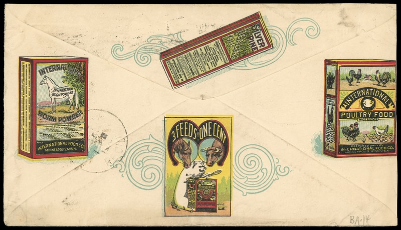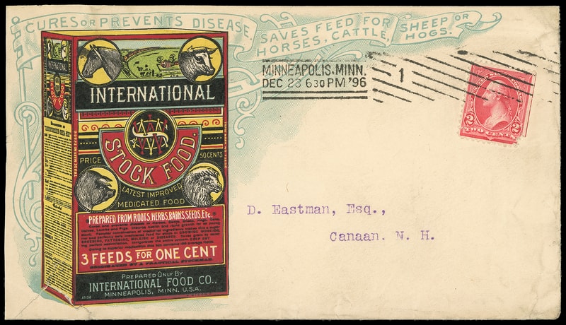(Animal) International Stock Food Co., 3 Feeds For One Cent, Minneapolis, Minn., multicolored illustrated design showing feed box with animal vignettes, additional ad text and feed boxes on reverse on cover bearing 2¢ carmine (279B), corner flaw, tied by "Minneapolis, Minn. Dec 23 '96" machine cancel to Canaan N.H.; barely reduced at left and open at top, cover tear at lower left, F.-V.F.