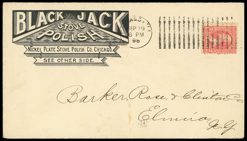 (Household Goods) Black Jack Stove Polish, Nickel Plate Stove Polish Co., Chicago Ill., corner card and overall illustrated ad showing polish can on cover bearing 2¢ carmine rose (279Bc) tied by "Chicago Ill. Sep 29 '98" machine cancel to Elmira N.Y., arrival backstamp; barely reduced at right, Very Fine.