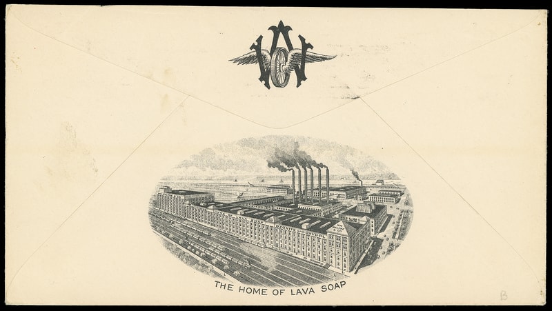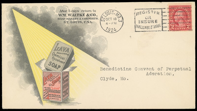 (Household Goods) Lava Soap, Wm. Waltke Soap Makers & Chemists, St. Louis Mo., multicolor illustrated ad design showing soap with additional building vignette on reverse of cover bearing 2¢ carmine coil tied by "St. Louis Mo., Oct 18, 1924" machine cancel to Clyde Mo., Extremely Fine.