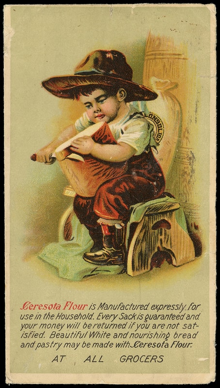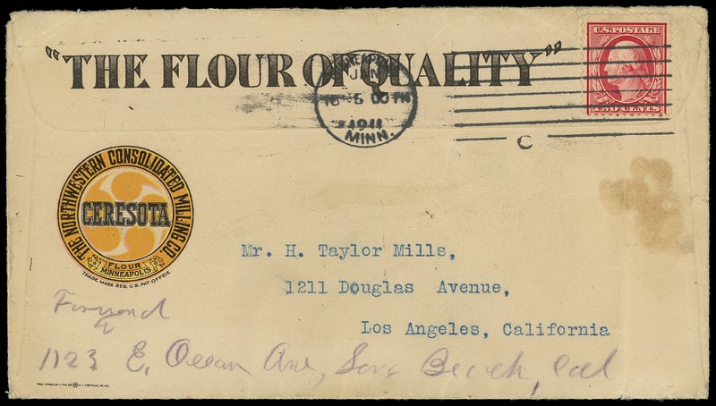 (Food & Drink) Ceresota Flour, The Northwestern Consolidated Milling Co., Minneapolis Minn., multicolor overall ad design showing boy carving bread on cover bearing on reverse 2¢ carmine tied by "Minneapolis Minn. Jun 16, 1911" machine cancel to Los Angeles Cal., forwarded to Long Beach; edge wear and small flaws, light stain, F.-V.F. and spectacular design.