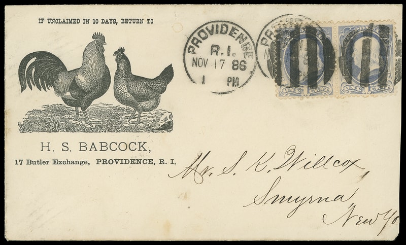(Animal - Poultry) H.S. Babcock, Providence R.I., illustrated corner card showing two chickens on cover bearing 1¢ blue gray (206) pair tied by bold four-grid duplexed with "Providence R.I., Nov 17 '86" duplex to Smyrna N.Y.; reduced at right, otherwise Very Fine and striking use.