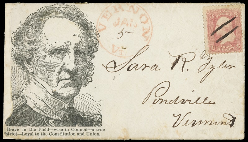 General Scott, large patriotic portrait of younger General with verse below, on cover bearing pen canceled 3¢ rose (65) , red "Vernon Vt Jan 5" cds to Pondville, Vermont, with carte-de-visite and original letter dated 1863 with some interesting content " Charles S. Harris was taken prisoner…I was exchanged about 3 weeks after that…he died the 17 day of September last. He had the typhoid fever but was getting better… " ; restored at left, Very Fine appearance; with clear 2025 P.F. certificate.
