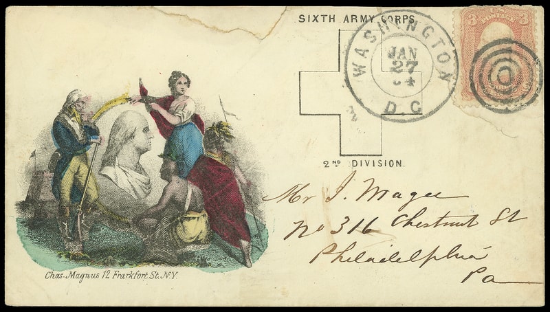 Sixth Army Corps, 2nd Division, hand-colored Magnus design on cover bearing 3¢ rose (65) tied by Washington D.C. Jan 27 '64" cds duplexed with target cancel to James Magee, Philadelphia Pa.; repaired tears, small flaws, Fine appearance, a rare Magnus design .