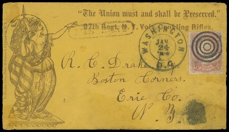 97th Regt. N.Y. Vols. Conkling Rifles. "The Union must and shall be Preserved", purple Lady Liberty and Flag patriotic design with "D. Murphy's Son" imprint on orange cover bearing 3¢ rose (65) tied by bold four-ring target duplexed with "Washington D.C. Jan 24 '64" cds to Boston Corners N.Y., partial "Miss Sent" framed handstamp; cover wear, 3¢ tear, F.-V.F. and scarce missent regimental design.
