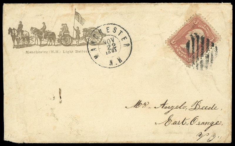 Manchester (N.H.) Light Battery., olive patriotic design showing horse-drawn cannon on cover bearing 3¢ rose (65) tied by open circular grid cancel, matching "Manchester N.H. Nov 22, 1861" cds to East Orange N.J.; reduced slightly at left, some wear and soiling, F.-V.F., ex-Walcott, Bischel .