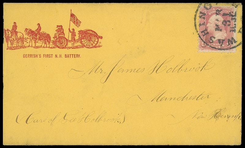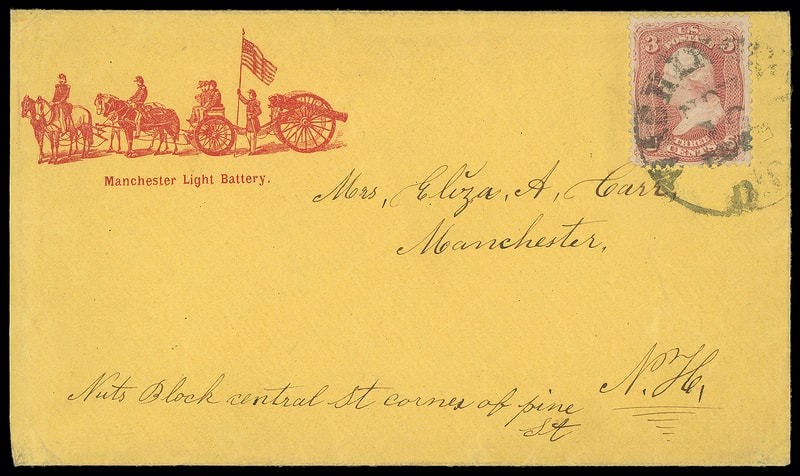 Manchester (N.H.) Light Battery., red patriotic design showing horse-drawn cannon on orange cover bearing 3¢ rose (65) tied by "Washington D.C. Nov 16, 186" cds to Manchester N.H.; reduced slightly at left, Very Fine.