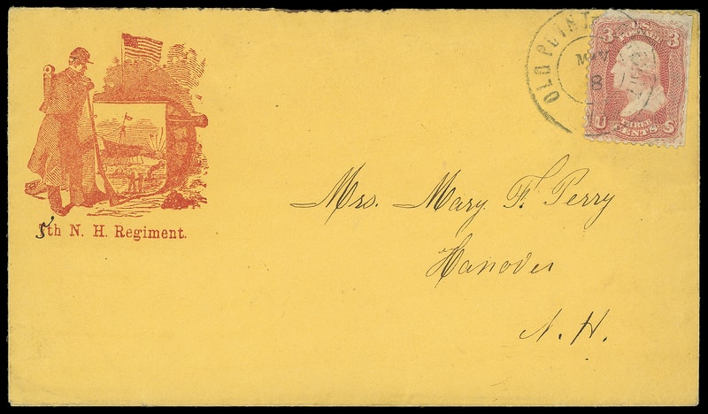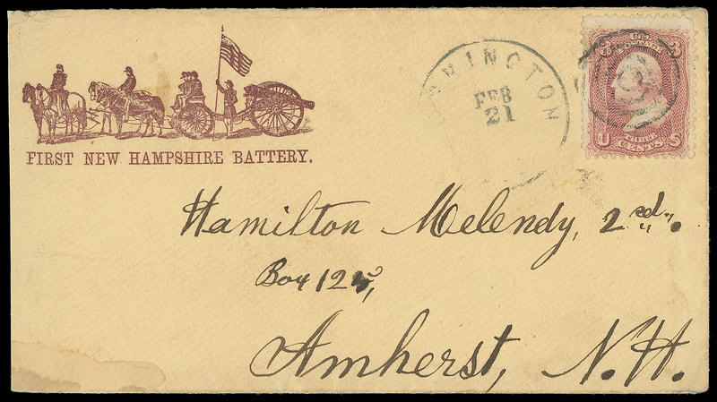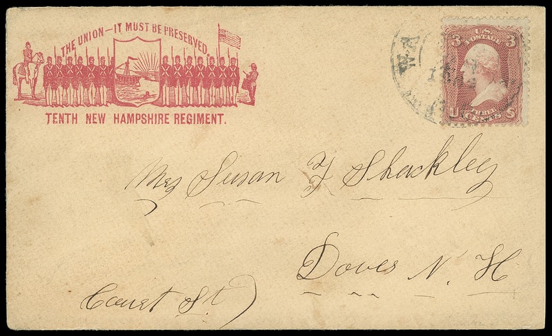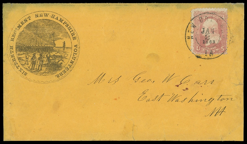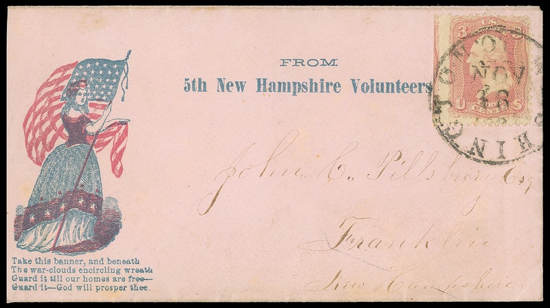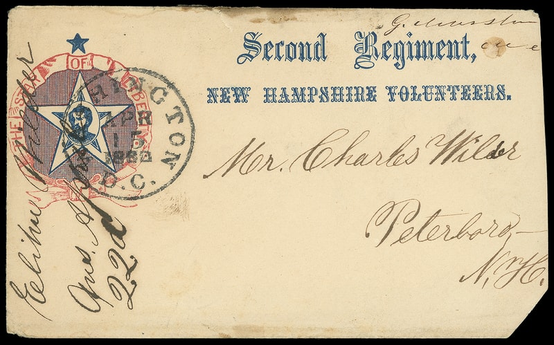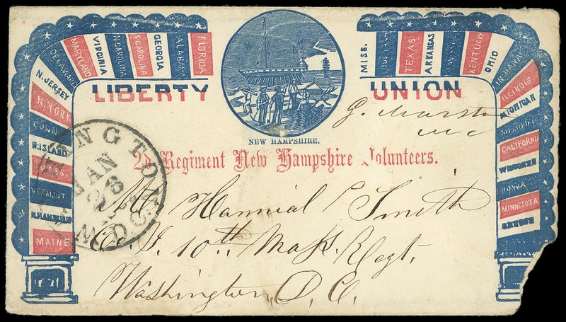 2d Regiment New Hampshire Volunteers, regimental imprint on red and blue Liberty and Union New Hampshire patriotic design with Magee imprint on cover free franked "G. Marston MC", entered mails with "Washington D.C. Jan 28, 1862" cds to Hannial P. Smith, C. V. 10th Mass. Regt., Washington D.C.; some abrasion, lower right corner torn away, F.-V.F. and rare, only recorded used example , ex-Walcott, Bischel .