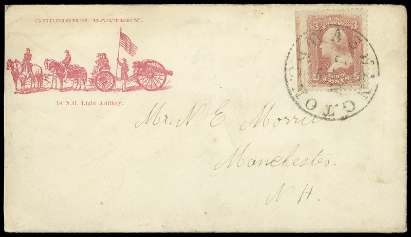 Garrish's Battery, 1st N.H. Light Artillery, red patriotic design showing horse-drawn cannon on cover bearing huge 3¢ rose (65) straddle-line s.e. single tied by "Washington D.C. Jan 3" cds to Manchester N.H.; some edge wear and reduced slightly at left, Very Fine, ex-Walcott, Bischel .