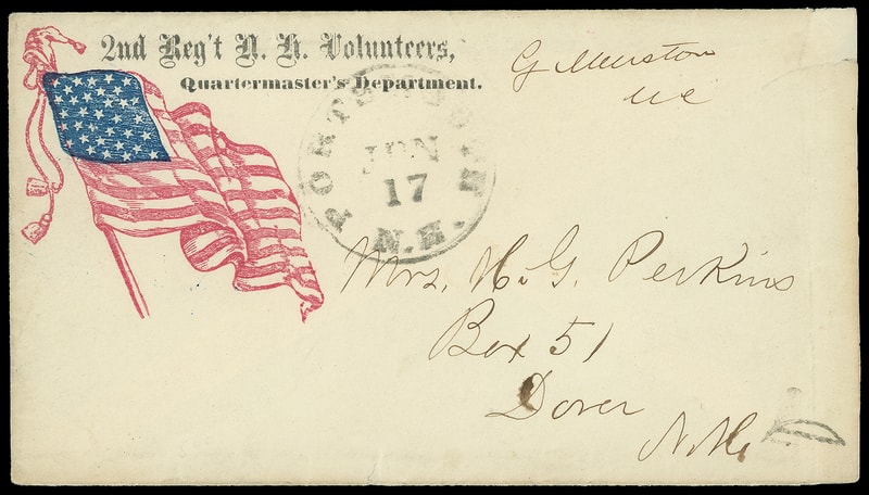 2nd Reg't N.H. Volunteers, Quartermaster's Department., regimental imprint on Waving Flag patriotic design on cover with " G. Marston M.C. " free frank endorsement to Dover N.H.; edge tear, Very Fine and rare regimental imprint, ex-Bischel . Walcott No. unlisted.