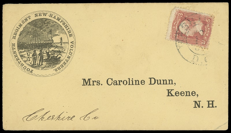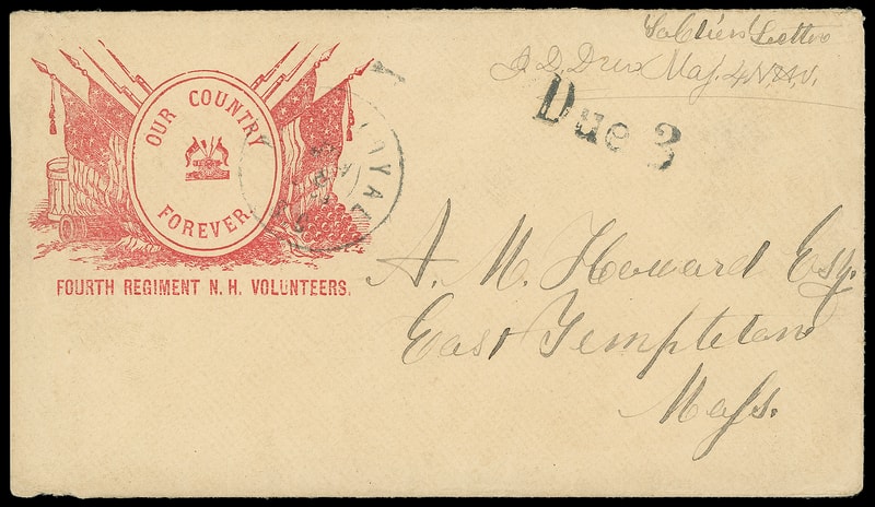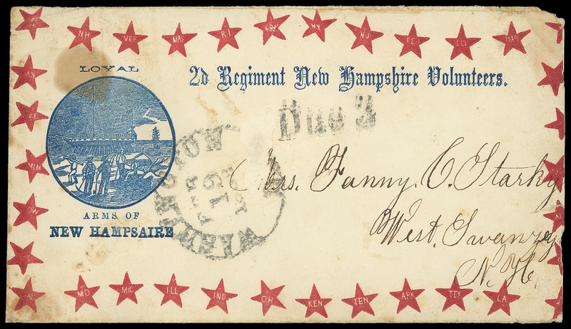 2d Regiment New Hampshire Volunteers, blue regimental imprint on "Loyal Arms of New Hampsaire" overall patriotic design showing state seal and state star border on cover with "Washington D.C. Feb 19, 1861" cds and matching "Due" rating handstamp to West Swanzey N.H.; tone spot, reduced a bit at right, Fine and exceptionally rare regimental imprint, only recorded used example , ex-Walcott, Bischel .