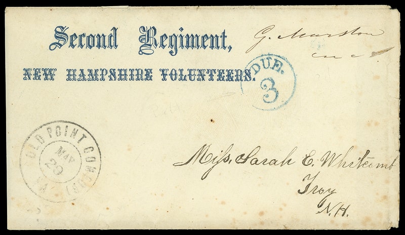 2d Regiment New Hampshire Volunteers, blue regimental imprint on patriotic cover with embossed Union and Constitution flap imprint, red and blue flap piping, entered mails with "Old Point Comfort, Va. May 29" cds and "G. Marston MC" free frank, Baltimore sharp blue " Due. 3 " in circle rating handstamp to Troy N.H.; reduced slightly at left, edge wear, F.-V.F., ex-Bischel .
