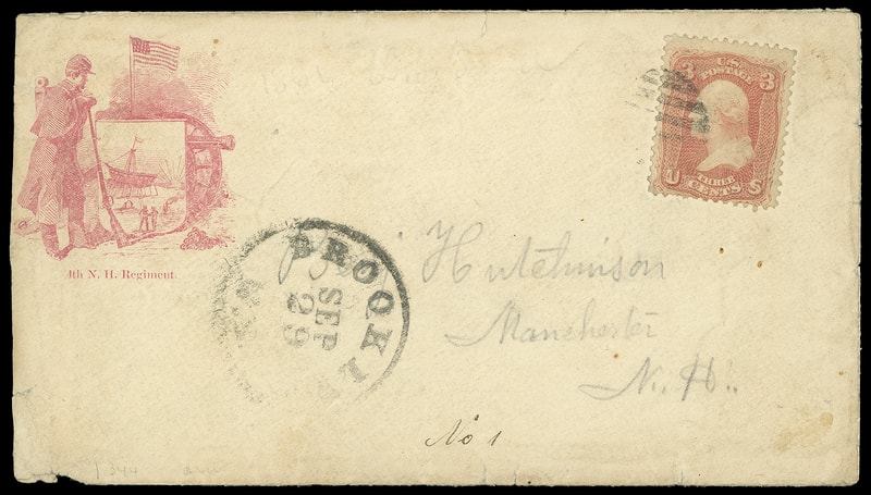 4th N.H. Regiment, red regimental patriotic design showing Soldier, Flag and Cannon on light buff cover bearing 3¢ rose (65) tied by partial grid cancel, matching "Brooklyn N.Y. Sep 29" cds to Manchester N.H.; reduced at left and edge wear, F.-V.F., ex-Bischel .