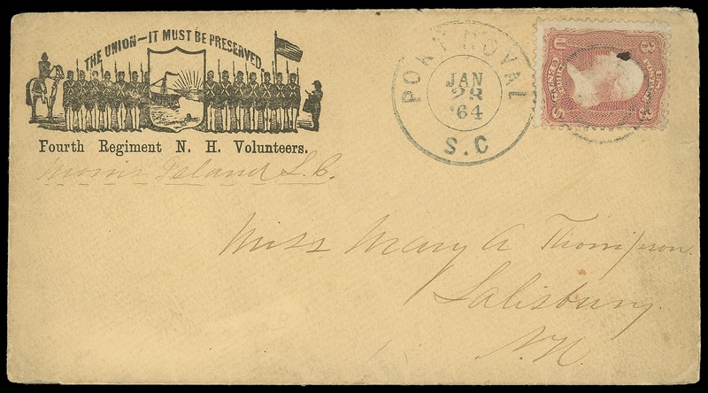 Fourth Regiment N.H. Volunteers, "The Union - It Must be Preserved", regimental patriotic showing soldiers and state seal with manuscript "Morris Island S.C." designation below on buff cover bearing 3¢ rose (65) tied by "Port Royal S.C. Jan 23 '64" duplex to Salisbury N.H.; 3¢ ink spot, still Very Fine.