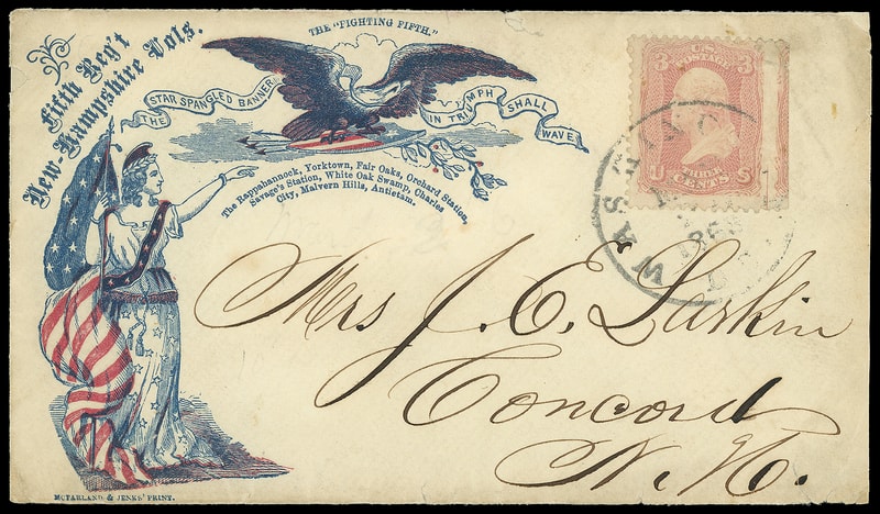 Fifth Reg't New-Hampshire Vols., red and blue Lady Liberty and Eagle patriotic design on cover bearing huge 3¢ rose (65) straddle-margin s.e. single, tied by "Washington D.C. May 30, 1863" cds; tiny mended edge flaws and reduced slightly at right, Very Fine appearing, only recorded used example .