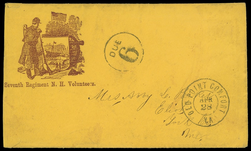 Seventh Regiment N.H. Volunteers, dark maroon regimental design on orange cover with sharp "Old Point Comfort Va. Apr 28l cds and matching "Due 6" in circle rating handstamp to Eliot Me.; reduced at leftand some wear, F.-V.F., ex-Bischel .