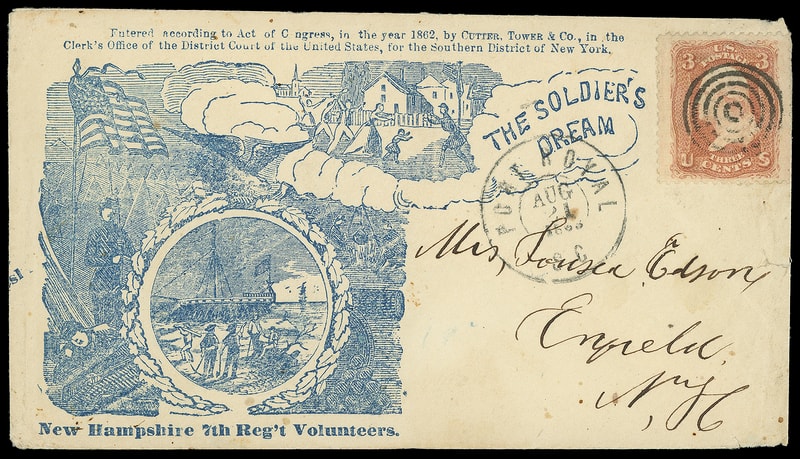 New Hampshire 7th Reg't Volunteers, blue "The Soldier's Dream" patriotic design with Cutter, Tower & Co. imprint on cover bearing 3¢ rose (65) canceled by five-ring target cancel, matching "Port Royal S.C. Aug 11, 1863" cds to Enfield N.H.; reduced slightly at right with edge tear, Very Fine and rare regimental patriotic.