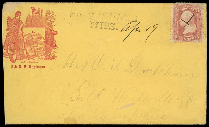 8th N.H. Regiment, scarlet red regimental patriotic design on orange cover bearing 3¢ rose (65), corner flaw, ms. "X" cancel, "Ship Island, Miss. Apr 19" two-line postmark with matching ms. dating to Woodsville N.H.; reduced at left, small flaws, Fine.