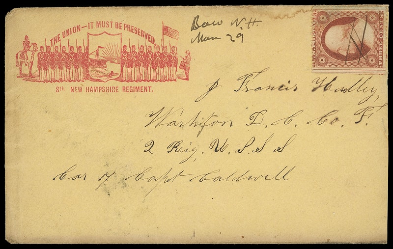 8th New Hampshire Regiment, red "The Union - It Must be Preserved" regimental patriotic on buff cover bearing 3¢ dull red (26) straddle-line s.e., ms. cancel, matching "Bow N.H. Mar 29" postmark to J. Francis Hudley, Co. F. 2 Reg. U.S.S.S., Washington D.C., care of Capt. Caldwell; reduced slightly at right, light edge staining, F.-V.F., ex-Bischel .