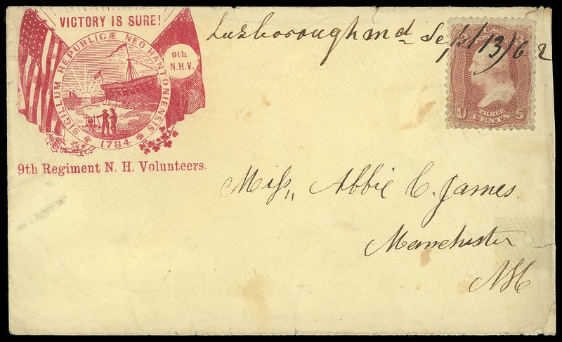 9th Regiment N.H. Volunteers, red regimental "Victory is Sure!" patriotic design showing state seal flanked by American and Regimental flags on amber cover bearing 3¢ rose (65) tied by ms. " Leesborough Md. Sept 13/62 " postmark to Manchester N.H.; reduced at right with small edge tear, F.-V.F., ex-Bischel .