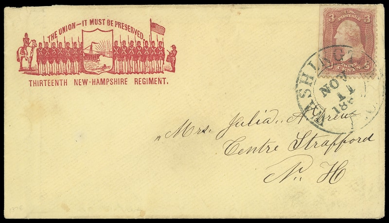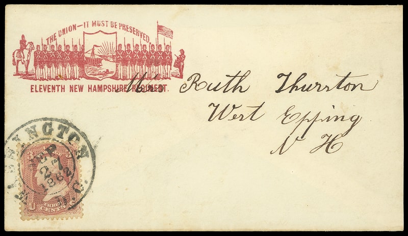 Thirteenth Regiment New-Hampshire Volunteers, regimental patriotic design showing state seal on cover bearing 3¢ rose (65) tied by "Washington City D.C." cds with preprinted address to Centre Barnstead N.H.; reduced slightly at right, couple tone spots, F.-V.F.