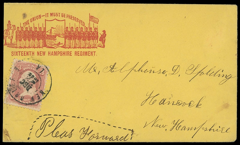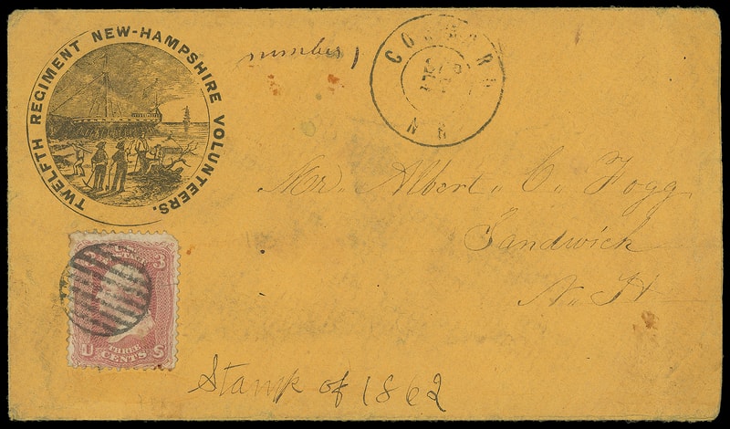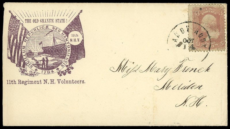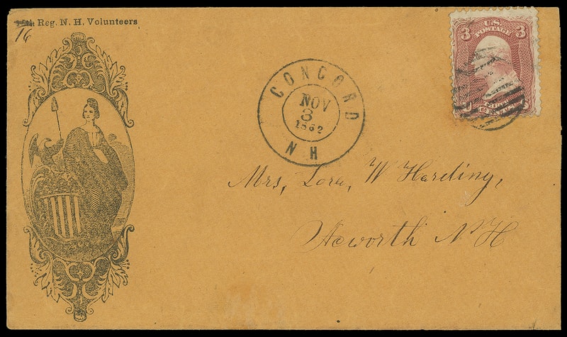 13th Regiment, New Hampshire Volunteers, regimental draped flag patriotic design on orange cover bearing 3¢ rose (65), faults, tied by "Washington D.C. Oct 31, 1862" cds to South Lyndborough N.H.; opening tear at top, minor stain in address, F.-V.F., ex-J.R. Hill Jr.