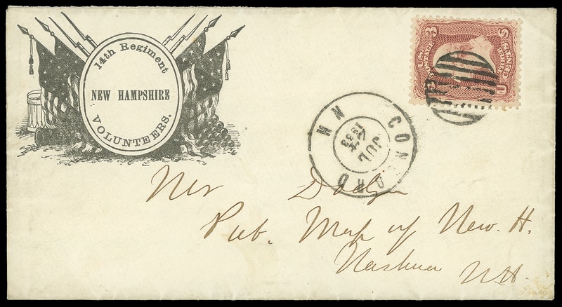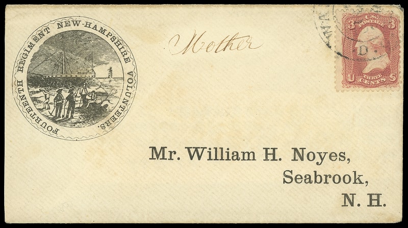 Fourteenth Regiment New-Hampshire Volunteers, regimental patriotic design showing state seal on cover bearing 3¢ rose (65), rounded corner, tied by partial "Washington City D.C." cds with preprinted address to Seabrook N.H., docketed "Mother"; reduced slightly at left, F.-V.F.