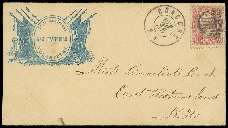 Fourteenth Regiment New-Hampshire Volunteers, regimental patriotic design showing state seal on buff cover bearing 3¢ rose (65), short corner, tied by partial "Washington D.C. Oct 19" cds with preprinted address to Keene N.H., Very Fine.