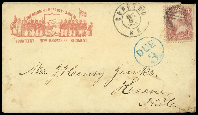 Thirteenth New-Hampshire Regiment, red "The Union - It Must be Preserved" regimental patriotic on amber cover bearing 3¢ rose (65) tied by circular grid cancel, matching "Concord N.H. Oct 2, 1862" cds to Keene N.H., neat "Due 3" circular handstamp; reduced slightly at right with small opening tear, F.-V.F.