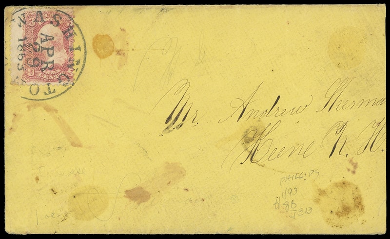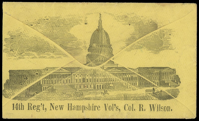 14th Reg't, New Hampshire Vol's, Col. R. Wilson, overall U.S. Capitol patriotic design on reverse of yellow cover bearing 3¢ rose (65) tied by "Washington D.C. Apr 29, 1863" cds to Keene N.H., accompanied by original "14th Regiment New-Hamshire Volunteers" printed lettersheet listing officers, datelined " Camp Grover, Montgomery county Md., Dec 21, 1862 " to friends at home saying he is well, on picket and guard duty, " …if I was at home I would never eat this provision that they deal out to us but I can live with it…I heard that they was a going to draft in old N Hampshire but none out of the town of Winchester…do they think that this will be settle this spring or not it looks dark to me but we have so many men in the field now…a great battle at Kingston North Carolina the Great Union Victory captured 500 prisoners 11 peace of artillery the uion is doind well so far one thing I heard that the 14 reg was pushing on to reinforce Burnside… "; cover reduced at right and stains on face, F.-V.F. and rare 14th Regimental patriotic pair, some good war content, ex-Bischel .