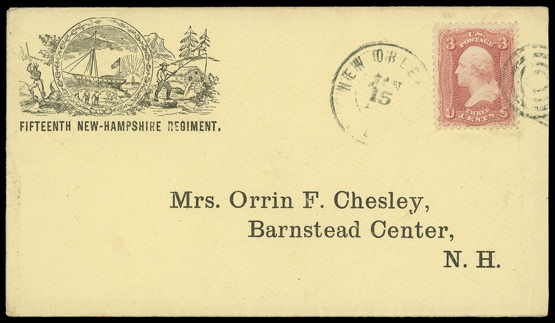 Fifteenth New-Hampshire Regiment., regimental patriotic design showing State Seal and wilderness scene on amber cover bearing 3¢ rose (65) tied by "New Orleans La., Jan 15" duplex with target cancel with preprinted address to Barnstead Center N.H.; reduced slightly at right, Very Fine and choice.